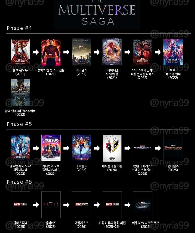 마블 영화는 큰 스토리라인에 따라 '페이즈'로 구분됩니다. 현재 페이즈 6까지 계획이 공개된 상태입니다.