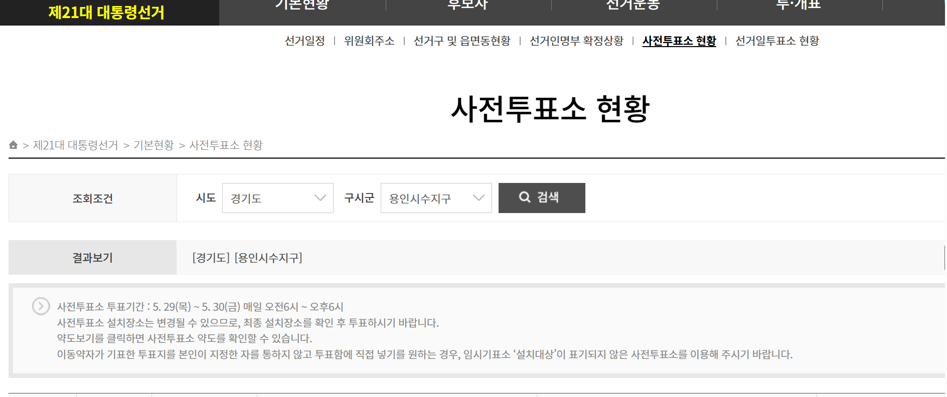 → '경기도' → '제주시'를 차례로 선택하면, 해당 지역에 설치된 모든 사전투표소가 리스트로 나옵니다.