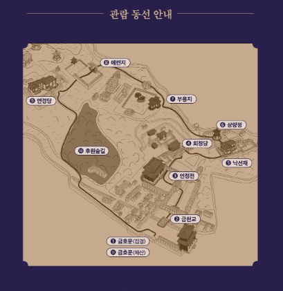 코스는 진선문 → 인정전 → 희정당 → 낙선재 → 상량정 → 부용지 → 불로문 → 애련정 → 연경당 → 후원 숲길로 이어지며, 각 지점에서 전문 해설사의 흥미로운 설명이 곁들여집니다.