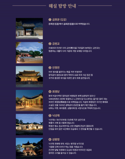 금천교 정면샷, 인정전 야경, 부용지 반사샷은 인생 사진을 남길 수 있는 스팟입니다.